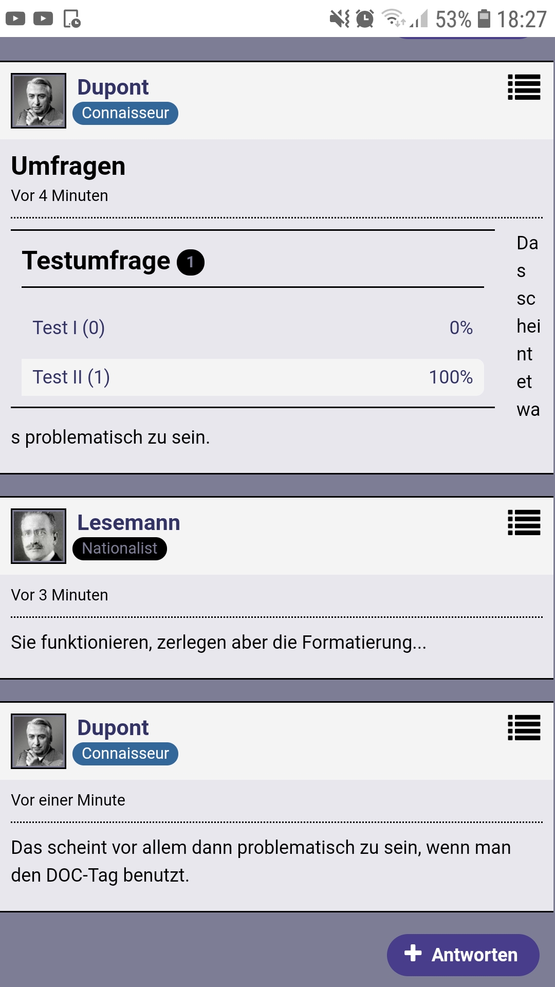 Umfragen 18. September 2019, 18:23 Testumfrage 2 Test I (0) 0% Test II (2) 100% Das scheint etwas problematisch zu sein. M. Clément Dupont